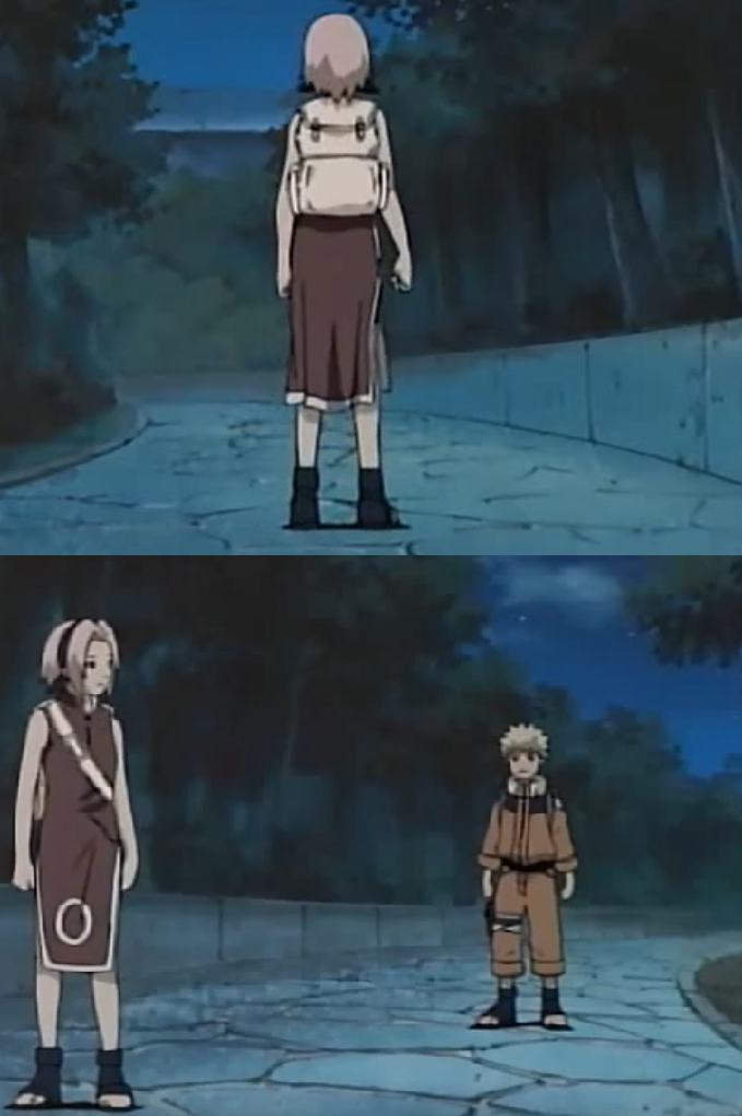 В итоге сцена её ухода пытается повторить сцену ухода Саске из деревни. Она точно так же идёт по этой дороге, ведущей к выходу, и точно так же её тут нагоняет Наруто...
