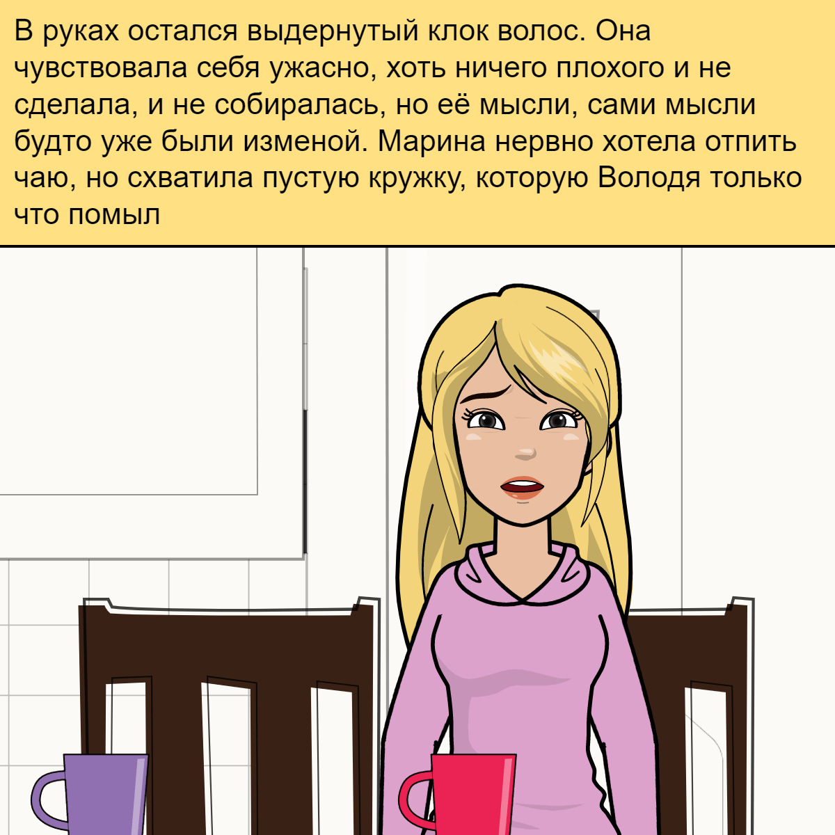 Содержание рассказа. Володя собрал кружки и тарелку из-под печенья и пошёл в ванную помыть. Марина ничего не сказала. Вышел обратно он уже без полотенца, а в синих трусах боксёрах с изображением гитары. -Высохли – Володя ответил на взгляд Марины, который остановился на трусах. -Я рада. – Марина Гроза закончилась, а дождь так и шёл сплошной стеной, и стучал по крыше. Какой завтра будет океан непонятно. Наверное, вынесет на берег кучу водорослей. А может там вообще шторм. -Думаю друзья уже не придут. Саша написал смс что будет только утром – Володя - придумал это только что. Марина замерла. -И что? – Марина. -Мы ж с тобой друзья – Володя улыбнулся. «Так горят его глаза, когда он на меня так смотрит, невозможно» - думала Марина -Ну…чтоб стать друзьями надо хорошо узнать друг друга, ну допустим друзья – Марина понимала к чему он клонит. Звук Марининого телефона нарушил их разговор. Она мигом подскочила к нему. СМС. Марина открыла и молча прочитала МАЛЫШКА, ЕЩЁ НЕ СПИШЬ? НЕ ОБИЖАЙСЯ НА МЕНЯ