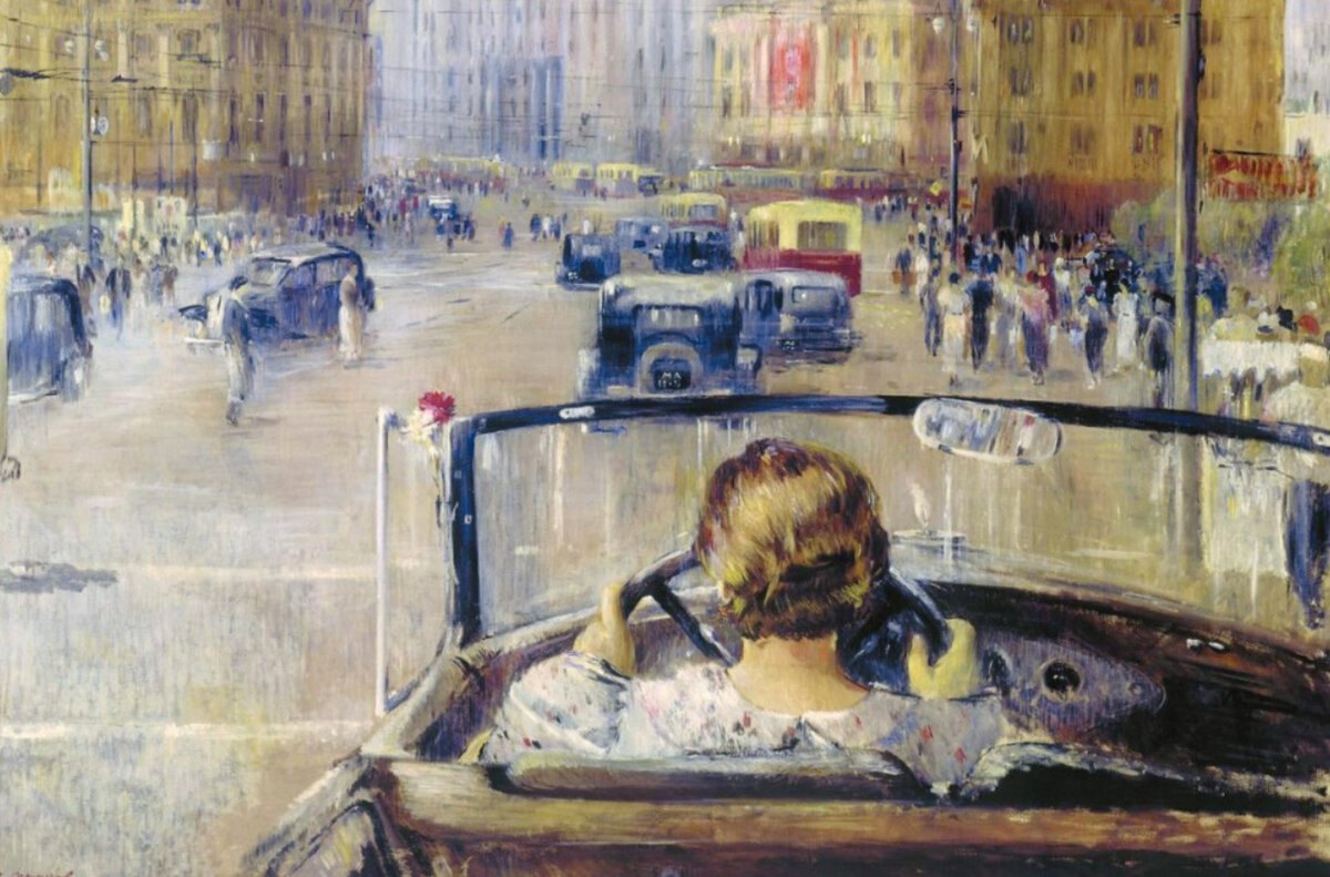 Может показаться, что после создания «Новой Москвы» перед Пименовым развернулся светлый путь (кстати, именно так назывался фильм Григория Александрова, вышедший на экраны в 1940-м; в нем героиня Любови Орловой, как на картине Пименова, едет по Москве, а затем летит над столицей в открытом авто).