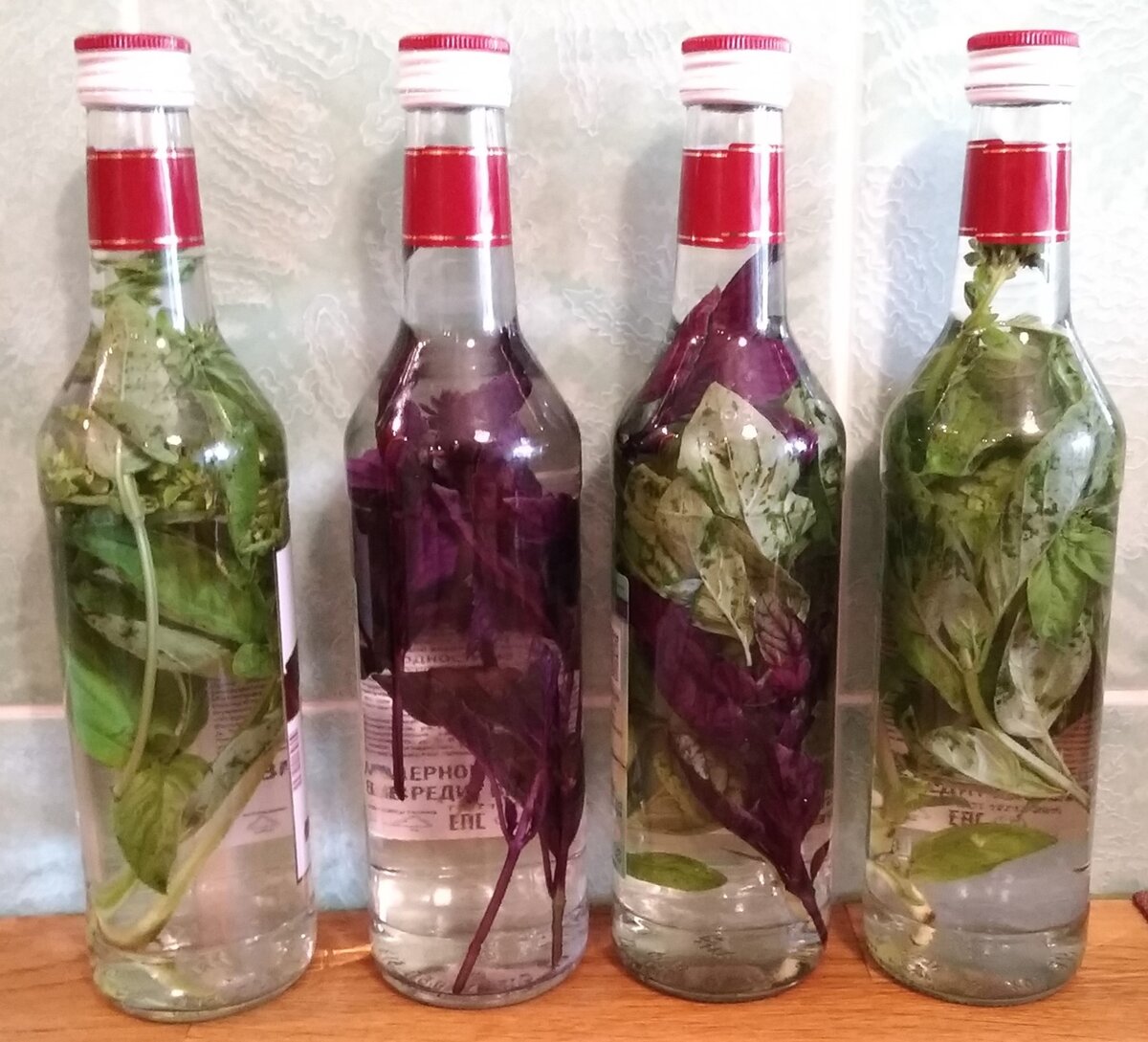 Этот рецепт я узнал от одного товарища лет семь-восемь назад и пользуюсь им каждый год, а он по нему делал настойку на базилике лет десять еще до того. Так что рецепт апробированный и реально работающий! Рекомендую всем, кто любит аромат и вкус базилика и хочет наслаждаться ими зимой. Для того чтобы сделать настойку водки на базилике, нужны, естественно, всего лишь 2 компонента: 1. Водка - желательно, на спирте “Альфа”, но вполне пойдет на спирте “Люкс”, но тогда она должна быть апробированная, желательно, ваша любимая. 2. Базилик зеленый (а не сушеный). На обычную пол-литровую бутылку водки достаточно 4 веточки базилика длиной 12-15 см. Любителям точных цифр сообщаю, “сколько точно вешать в граммах” – семь! Очень хорошее число. Если у вас веточки оказались более толстыми и вытянут 8 или 9 г – кладите столько, сколько они весят, хуже не будет! Сначала я отливаю из бутылки примерно 20 мл водки, так как ее некоторый объем будет вытеснен веточками. Затем прямо в бутылку, если позволяет п