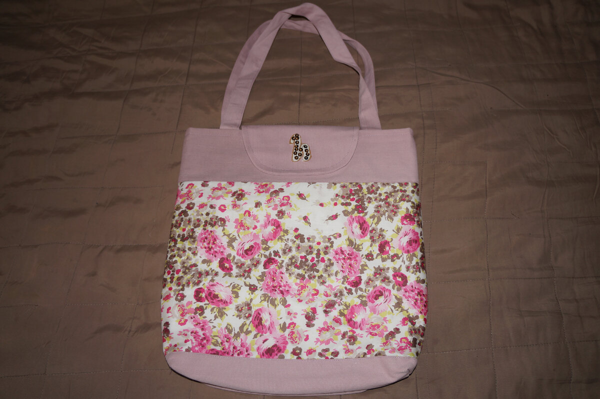 Джинсы розовые и сатин хлопковый в цветочек отлично подошли друг к другу. Застёжка магнитная кнопка на клапане. На клапан пришила срезанную с толстовки декоративную букву. Она с пайетками и немного переливается. Внутри обычный кармашек для мелочей. Подкладка из плащёвки белого цвета. Сумка на лето, для города или отпуска. Размер формата А4, довольно вместительная.