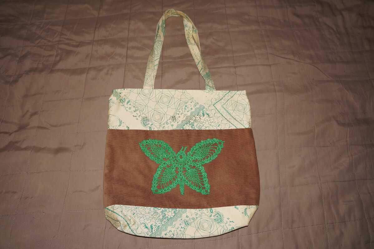 Коричневый микровельвет-остатки от юбки, бежевая джинсовка-остатки от плаща и вязаная крючком бабочка. Бабочку пришивала вручную. На машинке получается не аккуратно. А так очень симпатично. Сзади нет кармашков дополнительных. Ткани не хватило. Внутри кармашек под телефон. Подкладка из плащёвки. Застёжка магнитная кнопка. Сумка летняя, не очень большая, но много что поместится.