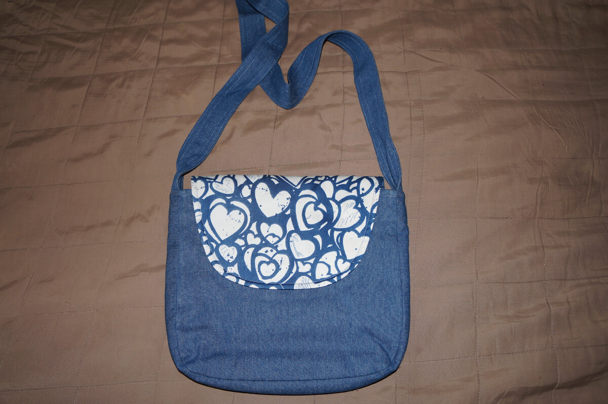 Джинса синяя и хлопок с сердечным рисунком, сердца немного размытые. Клапан перекидной, застёжка магнитная кнопка. Ручка длинная, через плечо. Сумка висит на бедре. Сзади пришила зигзагом кармашек от других джинс. Кармашек на молнии, можно положить и мелочь и ключи. Вся сумка внутри проложена стёганым синтепоном, кармашек для мелочей обязателен. Сумка и на лето и на осень-весну.