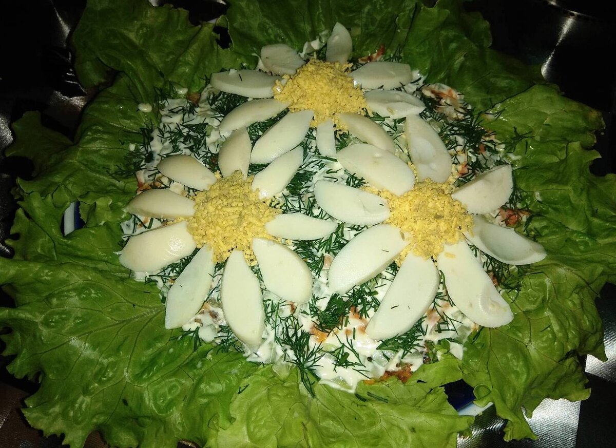 Очень яркий и аппетитный салатик выглядит словно ромашковая полянка. Готовится просто из обычных продуктов. Мудрить не придется совсем. Если только аккуратно повырезать лепестки для цветов из яичного белка и всё. Остальное быстро. Нам надо приготовить: Горшочек листьев зеленого салата 1 стакан отварного риса 1 банка консервы «Горбуша» (если не хочется рыбного салата, то можно обжарить кусочками куриное филе) 1 большая луковица (маринад: 100 мл.воды, 1 ст.ложка 9% уксуса, 1 чайная ложка сахара) 1 большая морковь на терке 1 свежий огурец 4 яйца Укроп, майонез Собираем салат: 1.Выкладываем на плоское блюдо листья салата. 2. Сначала идет рис, сверху мажем майонезом. 3. Горбушу разминаем вилкой на кусочки. Покрываем сеточкой майонеза. 4.Лук, нарезанный кусочками, маринуем и затем выкладываем. Майонез. 5. Морковь на крупной терке слегка обжариваем и тоже кладем слоем. 6.Далее идет слой нарезанного кубиками свежего огурца. Майонез. Мелко режем зеленый укроп и украшаем нашу полянку. 7.Желтки