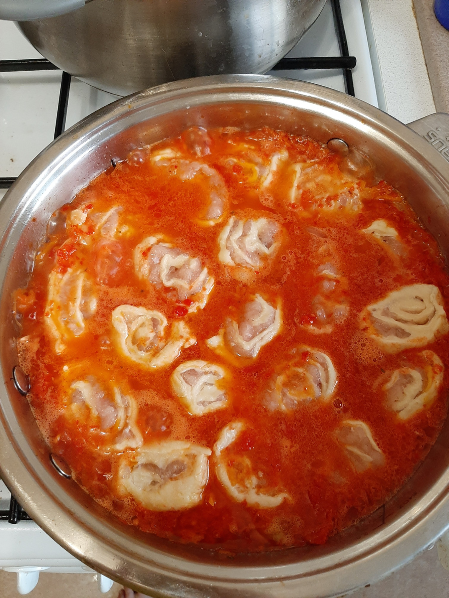 Для теста: Для начинки: Замешиваем тесто, раскатываем большой круг. Берем фарш и как бы намазываем его на наше раскатанное тесто. Смазали, теперь аккуратно скатываем в рулетик и нарезаем небольшими порциями по 2 сантиметра. В сковороде с большими бортами (или другой удобной посуде) обжариваем одну большую луковицу (я резала тонкие полукольца) и одну большую морковь (перетерла на терке). Далее нужно сделать бульон, в котором будут томиться наши "кружочки-пельмени". Есть два варианта: 1. Берем томатную пасту, разводим с водой и выливаем в сковороду, нужно немного прокипятить полученный соус. Воды необходимо брать из расчета, чтобы бульон слегка покрывал "кружочки-пельмени" 2. Для второго варианта я брала 4 помидора средних, 2 больших болгарских перца и измельчала их в блендере, добавила немного воды, примерно стакан (100 гр.) После выкладываем "кружочки-пельмени" в сковороду и тушим на среднем огне около 20 минут, главное следите, чтобы не выкипела воды и они не начали жариться. P.S.: В