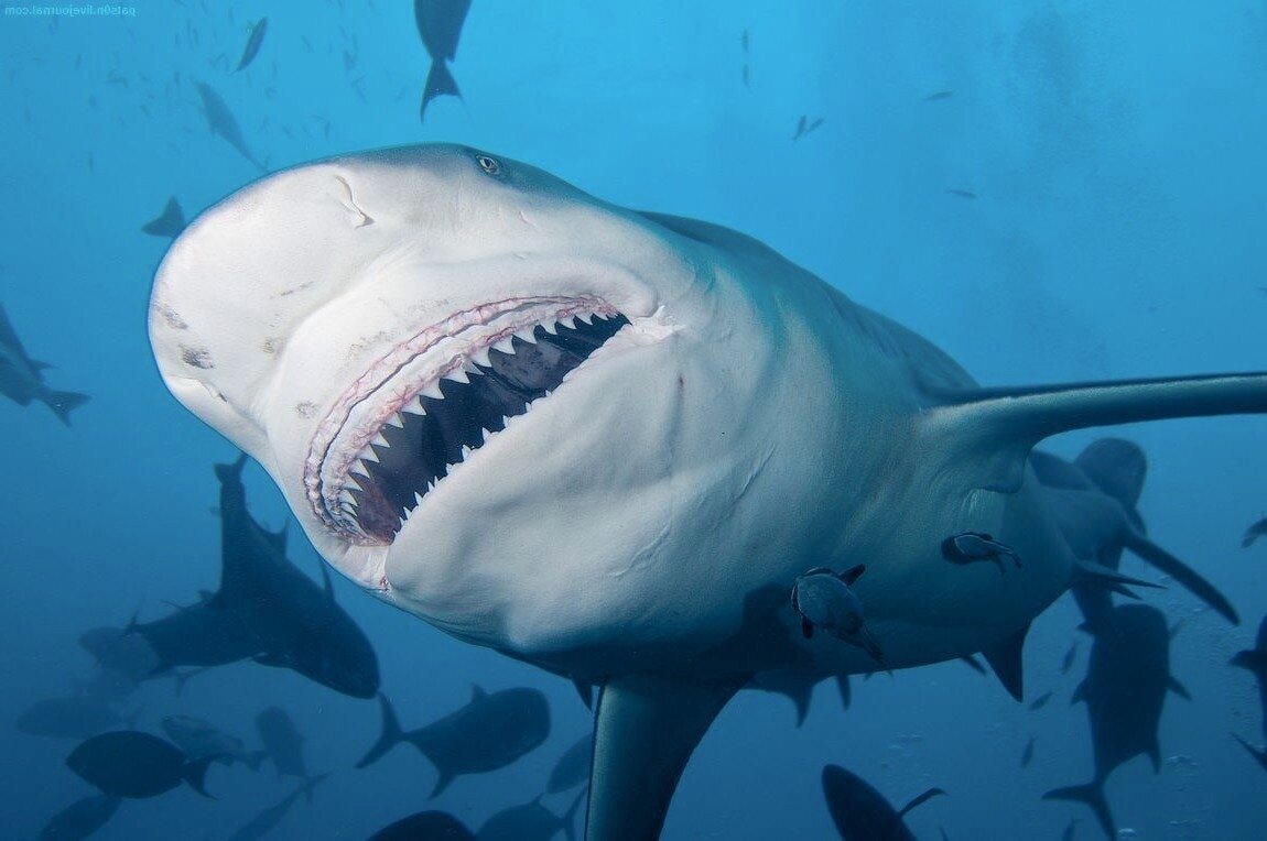 Океаны и моря вместе составляют самую гигантскую экосистему на нашей планете. В них обитают более миллиона самых разнообразных существ. Одни их них входят в число самых больших на Земле. Каждый вид животных имеет индивидуальные стратегии чтобы выжить. Они имеют мощные оружия для охоты, нападения и убийства. Это самые опасные животные океана. Океаны и моря составляют 2/3 нашей планеты. На любой глубине океана обитают необыкновенные и в то же время страшнейшие существа. Давайте узнаем их поближе. 1. Тупорылая акула или серая бычья акула, или акула-бык. Свое название тупорылая акула получила благодаря своему внешнему виду, в народе ее также называют акула-бык, так как очень часто она нападает на скот, который пригоняют пастухи на водопой, в основном используя мощнейший удар головой ,мгновенно сбивая жертву с ног. Но также часто жертвами этих акул становятся люди. Ее считают одной из самых страшнейших акул в мире. Она за несколько минут может разорвать свою добычу в клочья мощнейш