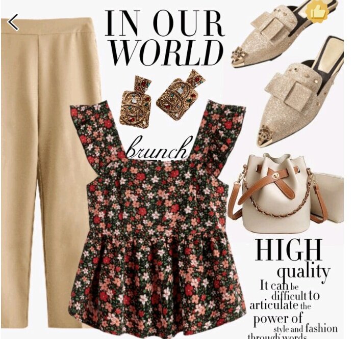 Brunch именуется примемом пищи, классификация которого может разниться между поздним завтраком или ранним обедом. Истинный Brunch сопровождается бокалом какого-либо алкогольного напитка или коктейля. И неважно игристое это вино или коктейль мимоза. Ниже будет представлен образ в стиле Casual Brunch, который был собран нами в интернет-магазине SHEIN. Блуза с цветочным принтом и оборкой: • Стиль - Бохо • Сезон - Лето • Тип - Пеплум • Детали - С оборками • Длина рукова - Без рукавов • Воротник - Квадратный воротник • Прозрачность - Нет • Тип застёжки - Полуверы • Материал - 100% полиэстер • Ткань - Лёгкая эластичная • ID товара - 2193451 Базовые одноцветные брюки: • Цвет - Хаки • Длина - Обрезанные • Сезон - Весна/Лето/Осень • Тип - Широкий • Детали - С карманами; на молнии • Линия талии - Высокая талия • Прозрачность - Нет • Материл - Полиэстер • Ингредиент - 97% полиэстер; 3% спандекс • Ткань - Лёгкая эластичная • ID товара - 1767920 Мюсли с бантом и заклёпками: • Цве