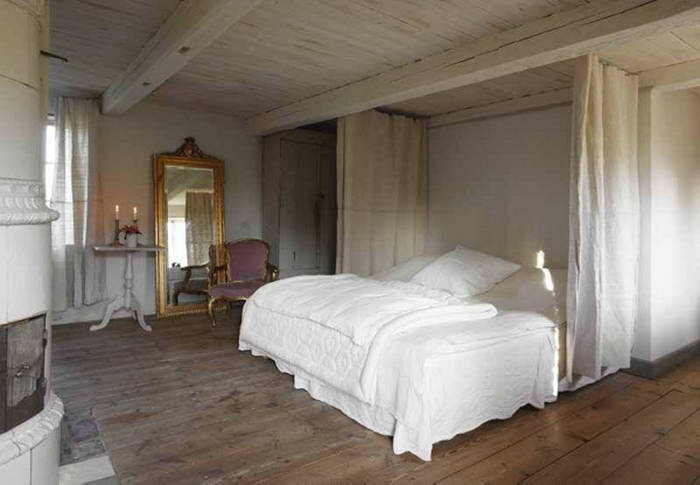 Почти все предметы и отделки в этом доме выполнены “под старину” или являются подлинным антиквариатом. Именно это и делает его особенным. Несмотря на монохромность интерьера, все выглядит очень интересно и совсем не скучно. Красота натурального дерева завораживает. А «подлинность» предметов мебели восхищает Отсутствие ярких красок не мешает воспринимать этот интерьер с интересом. Старое дерево потолка и старые книги на полках идеально вписываются в интерьер этой спальни. Чистоту и строгость белого цвета смягчает и «греет» натуральный цвет дерева. Оригинал статьи размещен здесь: http://fourwall.ru/interer-doma-v-stile-rustik/
