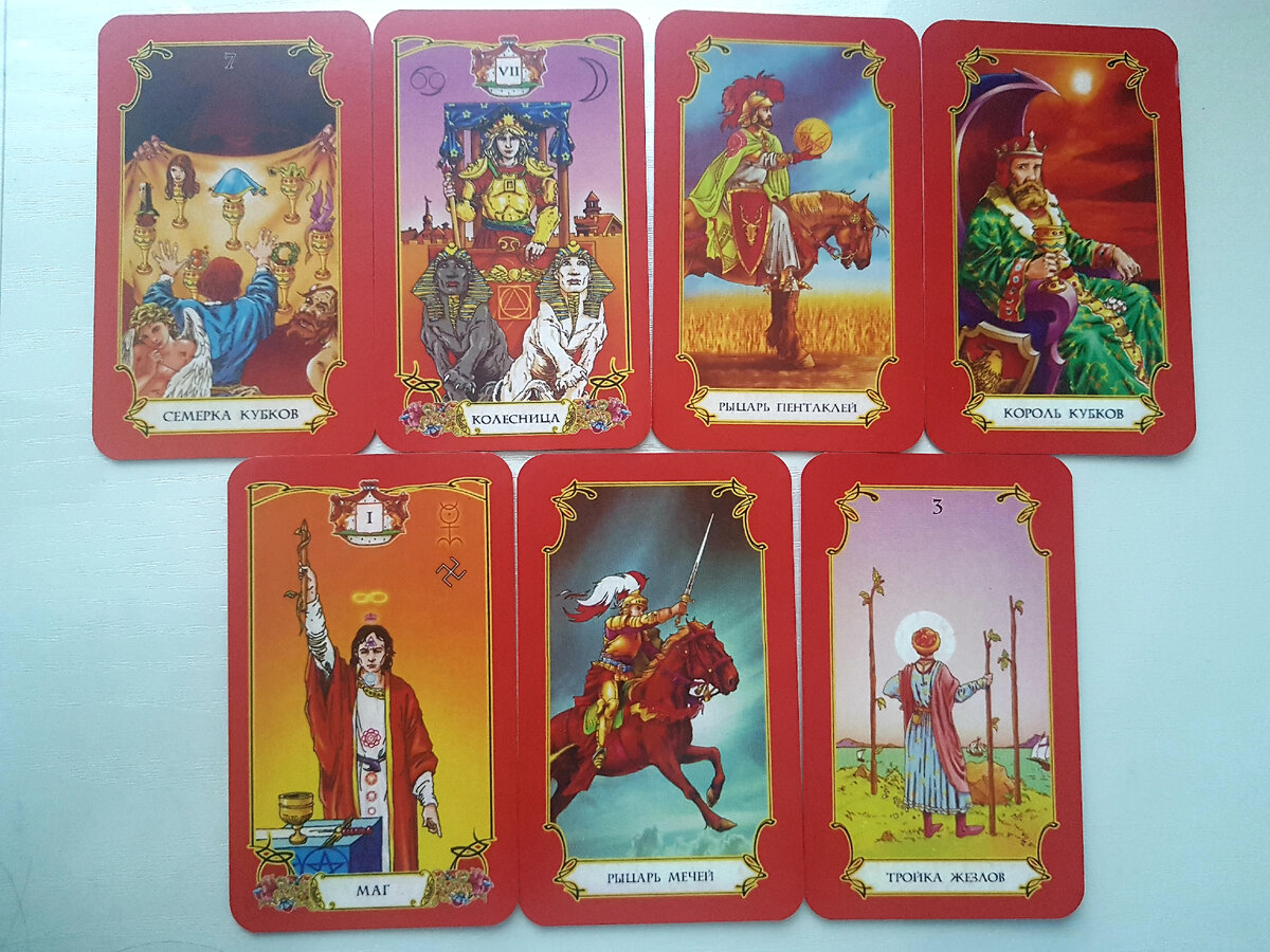 Приветствую вас мои дорогие подписчики и гости канала! Сегодня мы с вами будем гадать с целью помочь вам разобраться, насколько вы дороги вашему загаданному человеку, что думает о вас, что чувствует, какие у него намерения и что входит в его цели. Расклад у нас будет один, он общий, поэтому конечно подойдет не всем. Но я надеюсь, что в большей или меньшей степени сможет помочь вам разобраться в ситуации. (По личным раскладам пишите в WhatsApp +79312392809) Итак, вот ваш расклад: Смотрим: Мысли загаданного человека? 7 кубков Девочки, ваш загаданный человек весь в мечтах и фантазиях. Тут даже одну конкретную мысль сложно уловить, потому что они одна другой смелей. Кто-то здесь для желанной женщины курточку покупает, кто-то ведет в кино и на ужин, кто-то голову ломает как бы угодить что б и не дорого, но и приятно, а у кого-то мысли в воспоминания о приятном времени проведенном вместе. То есть вы поняли, в мыслях романтика. Чувства загаданного человека? Колесница Колесница ведает нам о с