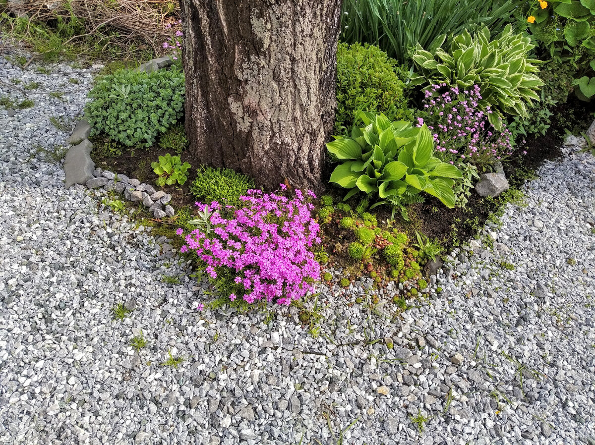 Несколько лет назад мы на своем садовом участке спилили большую березу. Она хорошо закрывала машину от солнца. Но вот птички.... Да и опасность того, что ее мог повалить сильный ветер (в березе было большое дупло) заставила нас все-таки принять такое решение. Оставили пенек и теперь это место, где можно положить что-то (инструмент, кашпо с цветком, телефон и т.д.). Вокруг него я посадила почвопокровные растения и теперь это неотъемлемая часть дизайна нашего участка. Просто время от времени я меняю что-то здесь.