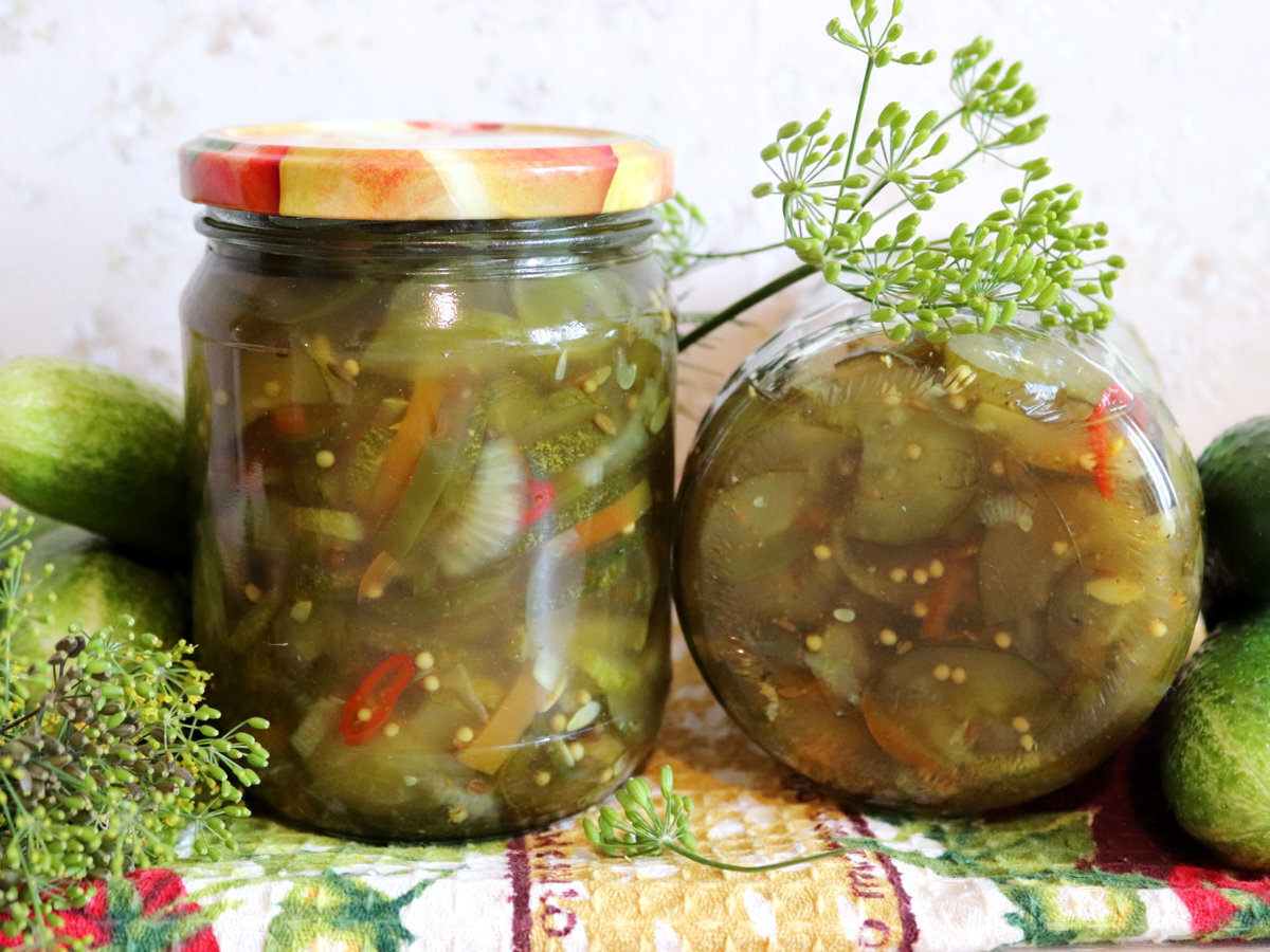 Уже по названию понятно, что такие огурцы отличное дополнение для бутербродов, хот-догов, бургеров, шавермы, их можно положить в салаты. Рецепт американский, а они любят сладкие маринады, поэтому огурчики сладкие, пряные и острые. Ккал: 69.65, время приготовления: 12 ч.20 мин. #Домашние заготовки #Русская #Закуска Основное Маринад Приготовление: 1. Огурчики "Бутербродные" готовятся в два этапа. На первом нам понадобятся овощи и соль. Лук и сладкие перцы указаны в штуках, размер овощей средний. Сладкий перец можно взять один крупный. 2. Лук и сладкий перец нарезать соломкой. 3. Огурцы нарезать тонкими полукольцами. 4. Соединить всю нарезку и всыпать соль. Аккуратно перемешать и дать постоять до начала выделения сока. 5. Затем придавить овощи тарелкой и сверху поставить какой-нибудь груз, например, банку с водой. Поставить кастрюлю в холодильник и оставить на ночь. 6. За ночь выделится много сока. Он солёный и уже не нужен, его выливаем. Попробуйте огурцы на вкус, если они очень солен