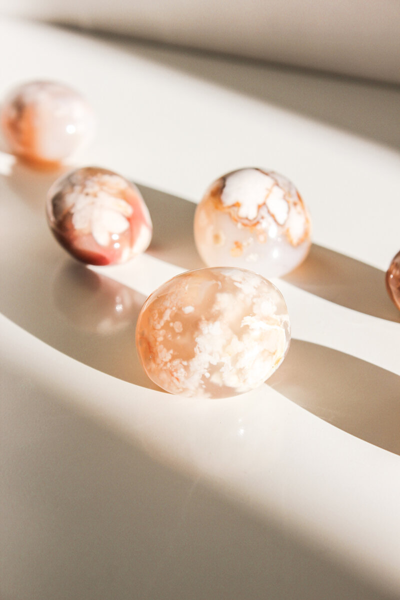 Агат – камень разнообразный по расцветке, встречаются цвета от белого до плотного черного, он может быть как полупрозрачным, так и непрозрачным, с различным рисунком или без него. Агат приносит умение говорить и принимать правильные решения, совершать правильный выбор и поступки, он укрепляет разум и делает человека проницательным, настраивает на волну восприятия тонкого мира, делает его яснослышащим, ясновидящим и яснообоняющим. Защищает от атак энергетического вампиризма. Серый агат — камень честных людей, он помогает уберечься от обмана. Усмиряет ссоры и конфликты, восстанавливает мир и равновесие в отношениях между людьми. Голубой агат способствует новшествам, усиливает творческие способности. Это камень деятельных, активных, креативных людей. Его не носят постоянно. Черный агат — оберег, защищающий от катастроф и негативного энергетического натиска. Он дает большую внутреннюю силу, твердость духа, прочность морального состояния и материального положения. Способствует укреплению жи