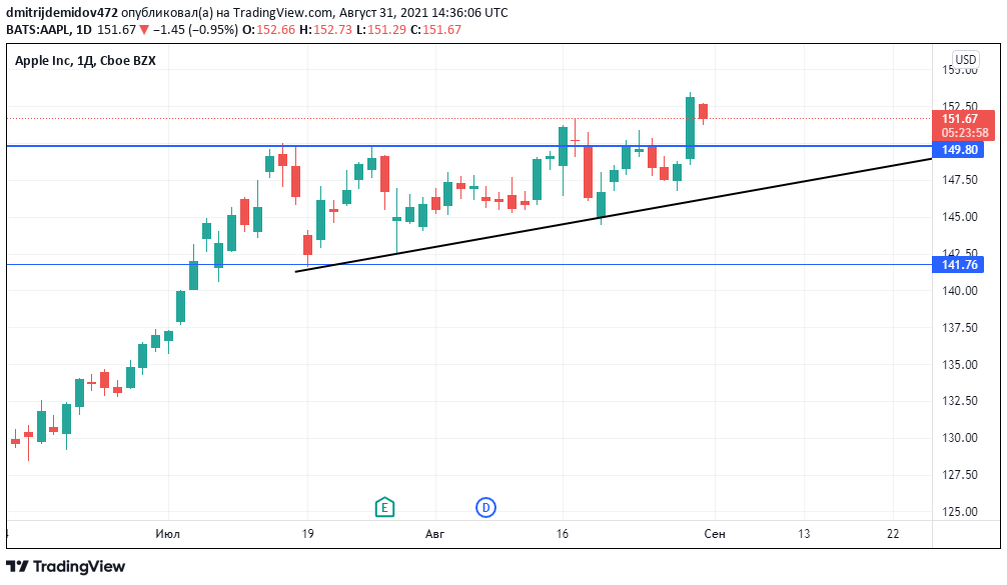 Приветствую. Американский фондовый рынок открылся разнонаправлено. Вначале открытия торгов рынки упали, но их начали медленно откупать. Однако, точную динамику сейчас определить трудно. В любом случае, мы рассмотрим акции компаний, которые рассматривали сравнительно недавно, чтобы посмотреть, появились те условия, о которых я говорил или же нет. Акции Apple: По акциям Эпл я советовал вам дождаться закрытия сессии и входить в лонг, если свеча будет закрываться полной и уверенной, чтобы пробитие было отчетливо видно многим участникам рынка. Сейчас акции проседают на открытии и некоторым читателям может показаться, что я намеренно посоветовал купить именно так, но я уверяю вас, что у меня этого не было в мыслях и рынок просто так себя обычно ведет. Это нередко для трейдеров – входить в сделку и видеть, что она пошла против тебя, но если анализ был сделан верно, то в большинстве случаев цена потом идет по прогнозу. Не нужно думать, что рынок намеренно идет конкретно против вас, такова его