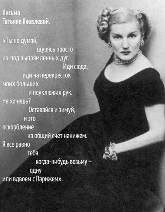 Владимир Маяковский, безудержно влюбленный в Татьяну Яковлеву, написал и посвятил ей два стихотворения. До встречи с Татьяной, предложение выйти за него замуж поступали только Лилии Брик. Но прекрасная и утонченная Татьяна Яковлева, смогла занять особое место в сердце поэта.