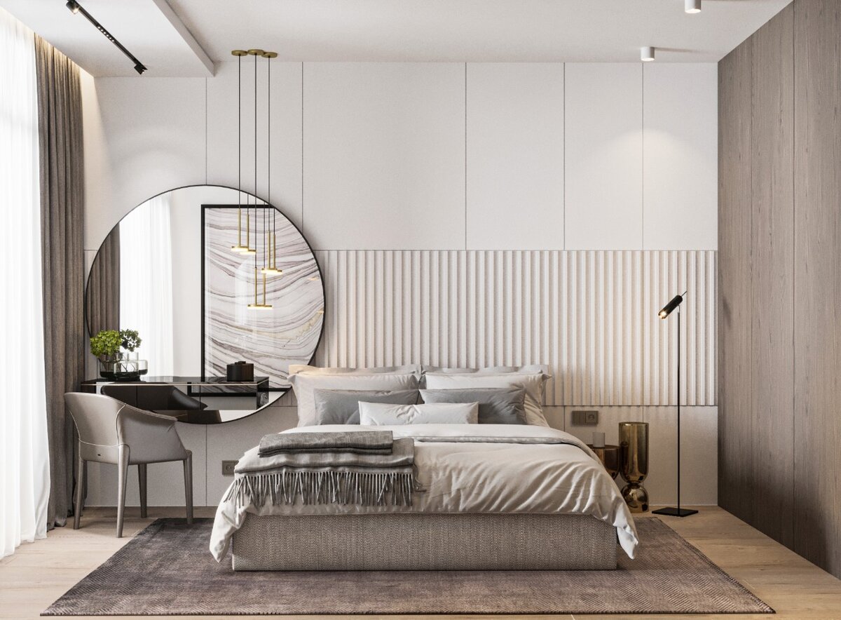 Наша студия дизайна интерьера разработала проект квартиры площадью 120 кв. метров на берегу Черного моря в Ялте. Ставку сделали на лаконичные формы, натуральные материалы и светлую гамму. В качестве основной палитры выбрали белый цвет. Он послужил удачным фоном для разнообразных текстур и оттенков. Интерьер получился стильный и современный, здесь нет ни одной лишней детали. Кухня совмещена с гостиной. Линейный гарнитур скрывается за раздвижными панелями, а вся необходимая бытовая техника встроена в колонны. Обеденная зона выделена фактурной стеной с подсветкой. Основной источник света расположен над столом. Светильники в стиле минимализм гармонируют с лаконичным черным столом и стульями. В гостиной много воздуха и света, данного эффекта удалось добиться за счет светлой отделки и минималистичной обстановки. В ТВ-зоне установлена стеновая панель с канелюрами и подсветкой. Телевизор "утоплен" в панель. В интерьере хозяйской спальни также использовали спокойные, нейтральные тона, располаг