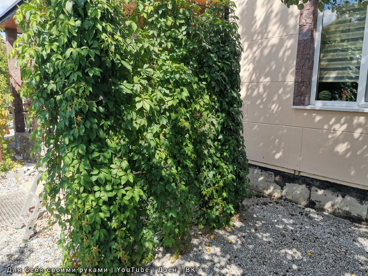 Привет друзья! Знаете, в чём вся прелесть дикого винограда, который я посадил возле летней веранды? Сейчас расскажу. Изначально предназначение дикого винограда было в следующем: нужно было затенять летнюю веранду от палящего солнца, так как она находится на южной стороне дома. С 12:00 дня, до самого заката на веранду светит солнце и сидеть на ней невыносимо. Поэтому было принято решение сделать живую зелёную изгородь, которая будет немножко охлаждать воздух и затенять от солнца. Виноград через несколько лет разросся и стал выполнять своё прямое предназначение, на веранде стало намного комфортнее находиться. Но спустя годы, я заметил от него ещё одну пользу, помимо дающей тени он ещё хорошо вытягивает влагу из грунта, тем самым осушая почву. Это очень полезно для фундамента дома, так как у меня близко находятся грунтовые воды. Также в 3 метрах от фундамента, находятся зеленые насаждения из кустов Сирени и Амурского бархата и на углу дома растёт большая Груша, которая также очень сильн