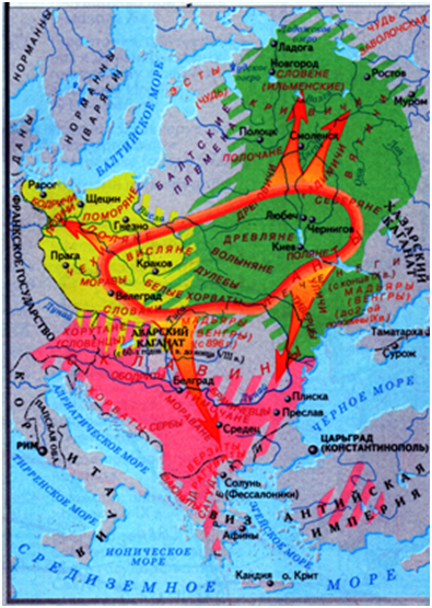 Часть II. Расселение. Память народная уж не упомнит, но хроники раннего Средневековья указывают на то, что первым пристанищем славян в Европе были земли в Прикарпатье, где осели они на долгие столетия. Будучи единым племенем и управляемые одним князем славяне вначале жили мирно, участвуя лишь иногда в военных походах в рамках союза с другими народами. Но со временем пошли раздоры между народом славянским и начали они делится на отдельные племена. К VI веку мы уже видим их расселение до р.Вислы и к северу от Черного моря. Количество людей увеличивалось и начали создаваться союзы уже между славянскими племенами, которые с этих пор становятся грозной силой в Европе. К началу IX века расселение древних славян завершилось и на европейской части России мы видим следующие племена: Поляне – заняли области по обоим берегам р.Днепр и основали Киев. Согласно “Повести временных лет" обладали нравом кротким и тихим, в отличии от других восточнославянских племен. Название свое получили, скорее всег