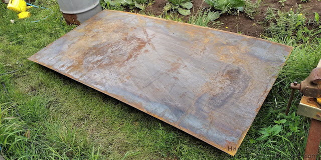 Сегодня займемся строительными делами, а точнее, будем варить небольшую банную печь из листа металла толщиной 3 мм стандартного размера 250 на 125 см. Делать будем по проекту ниже, расчитанному на минимальное количество частей резки и сварки - высота печки составит 125 см, длина - 65 см, ширина - 40 см. Объем резервуара под воду - 65 л, полный объем каменки примерно 140 л, а полезный около половины от него. Каменка закрытого типа с периодическим нагревом, т.е. камни нагреваются непосредственно от топки и проходящего между ними дыма (классический вариант), однако, можно сделать и с постоянным нагревом, огородив камни перегородкой и пустив сквозной дымоход. Вырезать части листа будем по данному ниже лекалу последовательно начиная с номера "1" и заканчивая номером "7", сразу все части вырезать не следует, так как придется подгонять их по месту и размеры могут не совпасть. Для работы нам понадобятся: Для работы потребуется ровная, плоская поверхность, выровненная под уровень. Для начала вы