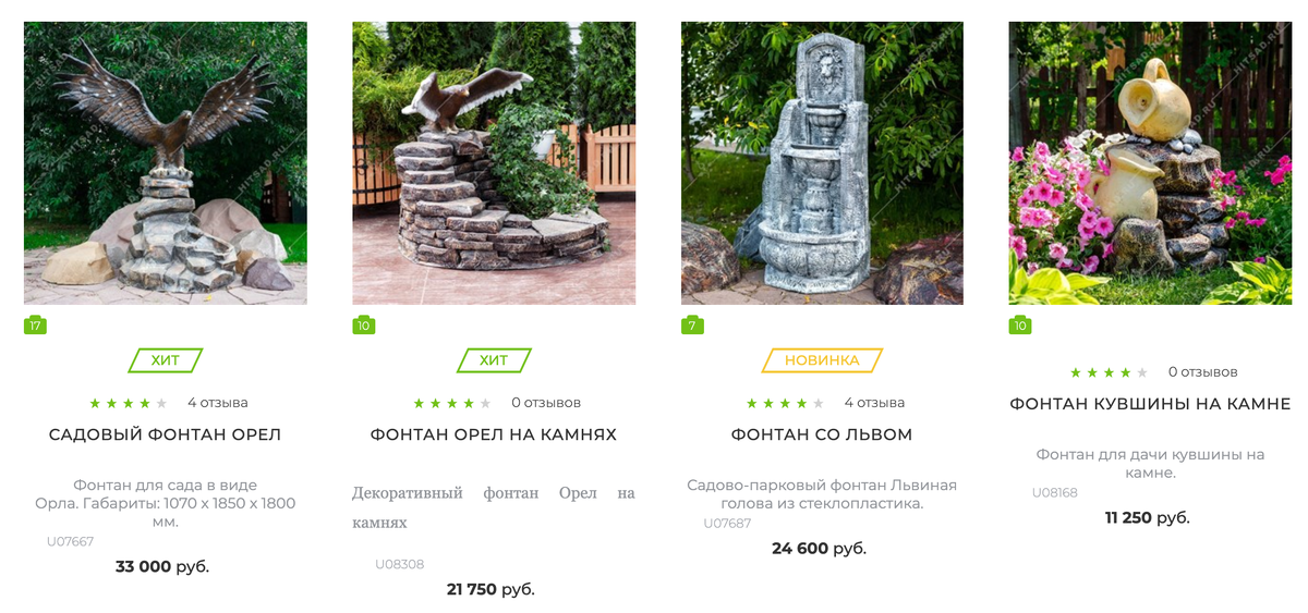 Фонтаны Далеко не каждый может сделать на участке пруд или водоемом. Его вполне может заменить декоративный фонтан, который занимает совсем немного места в саду. • Фонтаны HiTSAD не требуют дополнительных аксессуаров для установки. • Фонтаны в виде статуи, пеньков, камней, коры деревьев, с кувшинами, с дизайном птиц и животных. • В дополнение можно подобрать фигурки животных для создания общего стиля оформления участка. • Вода циркулирует по замкнутой системе с помощью помпы, подключение к источнику водоснабжения не требуется. • У кого в саду еще нет фонтана? Все скорее к нам за свежими новинками. • Любых размеров и форм, в цветном исполнении или под бронзу. • Изготавливаются из влагостойкого композитного материала. Умывальники • Все умывальники выполнены из прочного стеклопластика, конструкция устойчива, поэтому его можно размещать в любой части дачного участка, обычно это места с удобным доступом и проходом, например, нужно быстро помыть руки либо овощи для салата и