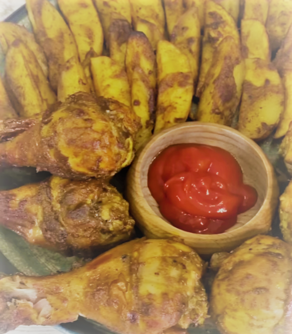 Ножки протыкаем зубочисткой и подвешиваем на решетку. А картофель отправляем в тот маринад, где была курица