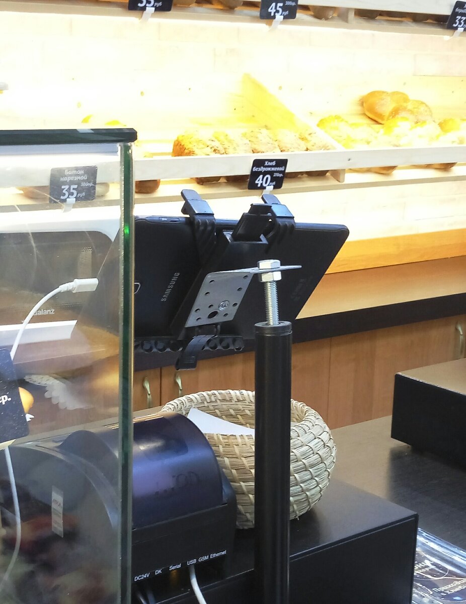 В последнее время набирают популярность кассовые решения с использованием планшетов. Стоят относительно недорого и занимают немного места — для малого бизнеса то, что нужно! Есть лишь небольшая проблема с размещением планшетов на рабочем месте. По моим наблюдениям владельцы торговых точек как только не стараются выйти из положения. В одной мини-пекарне видел вот такой вариант решения