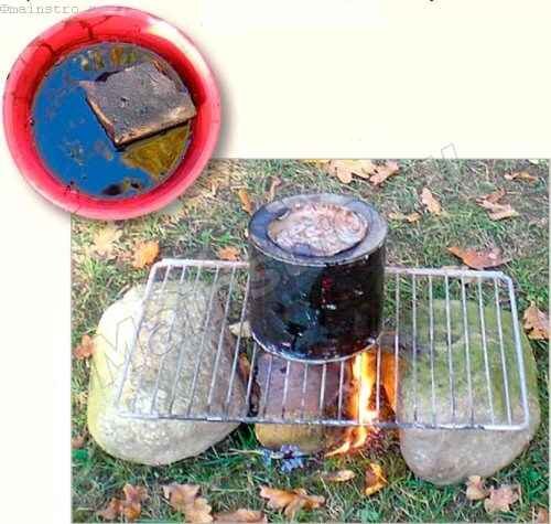 Во многих строительных (и не только) делах у меня есть незаменимый помощник — обычный красный кирпич. Чтобы сделать мелкий ремонт мягкой кровли, разогреть в небольшом объёме битум или мастику расплавить свинец, согнуть пластиковую трубу, подсушить в сырую погоду в лесу или на рыбалке(охоте) носки, перчатки, заварить чай или просто отогреть руки, не обязательно разжигать большой костёр, на который необходимо затратить немало времени и сил, особенно в сырую погоду. Кирпич замачиваю (заливаю) в керосине на сутки, после чего герметично упаковываю в целлофановый пакет, газету и ещё раз в целлофановый пакет. Своими порами кирпич впитывает керосин и тем самым превращается в готовый и безопасный элемент длительного горения, который остаётся только поджечь в нужном месте и в нужное время. Подобные приготовления я делаю перед целевой поездкой по грибы, на рыбалку или просто перед выездом на природу. Такой костёр можно разжечь в считанные секунды, и получается он абсолютно безопасным. В зависимо