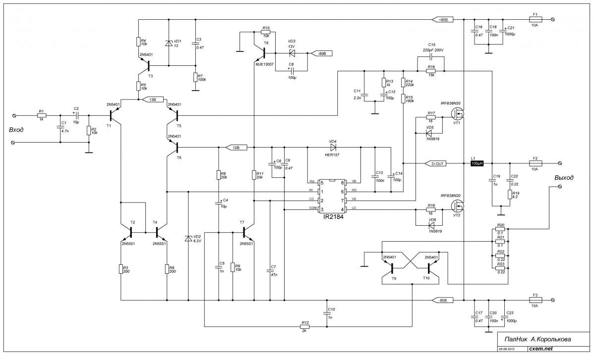 На плате размером 130*200 мм удалось разместить преобразователь напряжения 12-2*55 В, усилитель, фильтр и блок защит.