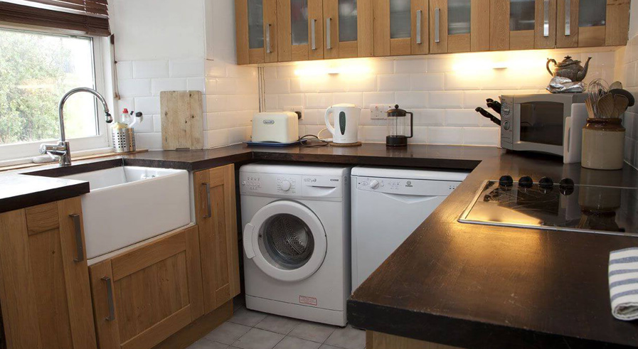 Цоколь кухни будет завышенным. Произойдёт это из-за того, что машинка в высоту около 90 см, ещё 1-2 см нужно для зазора между столешницей, которая тоже в толщину где-то 5 см. Получается, что высота кухни будет 96 см, а для низких людей это крайне неудобно.