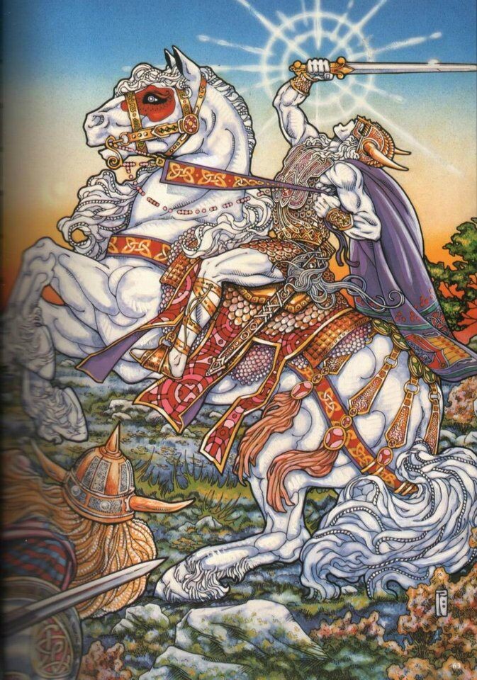 Луг и Огма сопровождали Дагду в лагерь фоморов, чтобы вернуть похищенную во время битвы арфу Дагды.