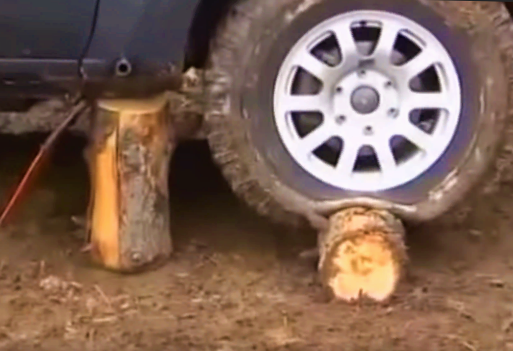 Нам нужно найти 2 пенька или бревна, на одно мы заедем, а второе подставим вместо домкрата. После чего съезжаем с первого бревна и вуаля - машина стоит на подпорке.
