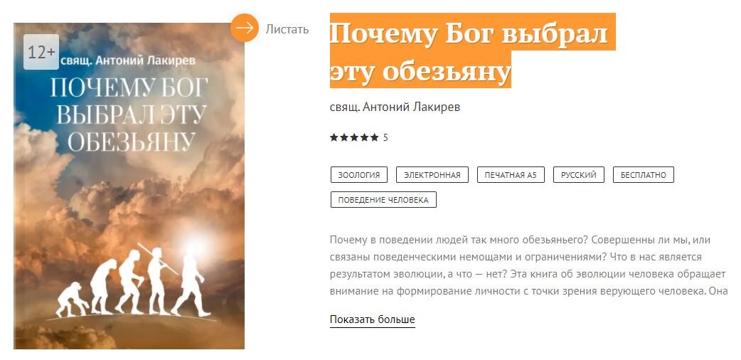 Священник Антоний Лакирев (в прошлом биолог, а ныне известный библеист) написал книгу о происхождении человека "Почему Бог выбрал эту обезьяну". По словам автора он попытался систематизировать то, что знает об эволюции человека. Отец Антоний отталкивается от факта, что человек произошел от обезьяны и ищет ответ на вопрос: что в людях «такого», что сделало их способными стать не просто самыми умными приматами, но и Божьими детьми?