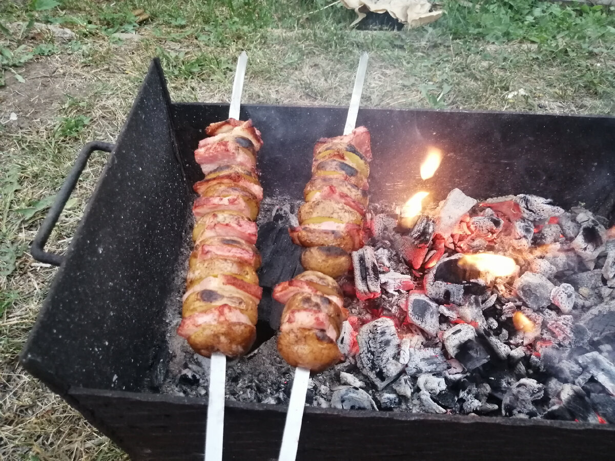 Отличная закуска на мангале для посиделок с родными и друзьями. Для этого нам нужно, немного молодого картофеля и сало желательно с мясной прослойкой. Нарезаем картофель кружками толщиной примерно 1см, а сало квадратиками тоже 1 см. Солим перчим, и насаживаем на шампуры. Вот так это выглядит. Жарим минут 20 и наслаждаемся вкусной закуской. Обязательно поджариваем хлеб до хрустящей корочки и закуска готова.