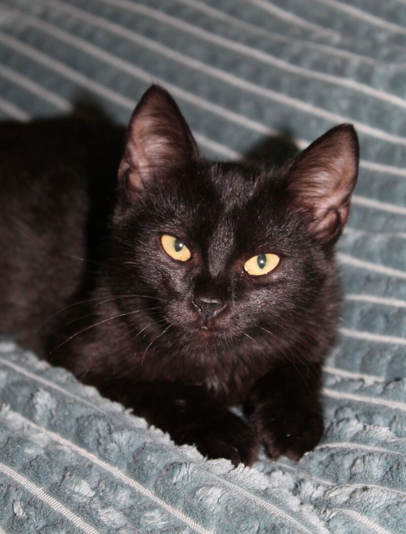 Котёнку около шести месяцев. Она очень ручная и ласковая. Постоянно ходит за человеком и ждёт внимания, но не навязывается и не наглеет. Девочка чёрная с головы до пяточек, как настоящая