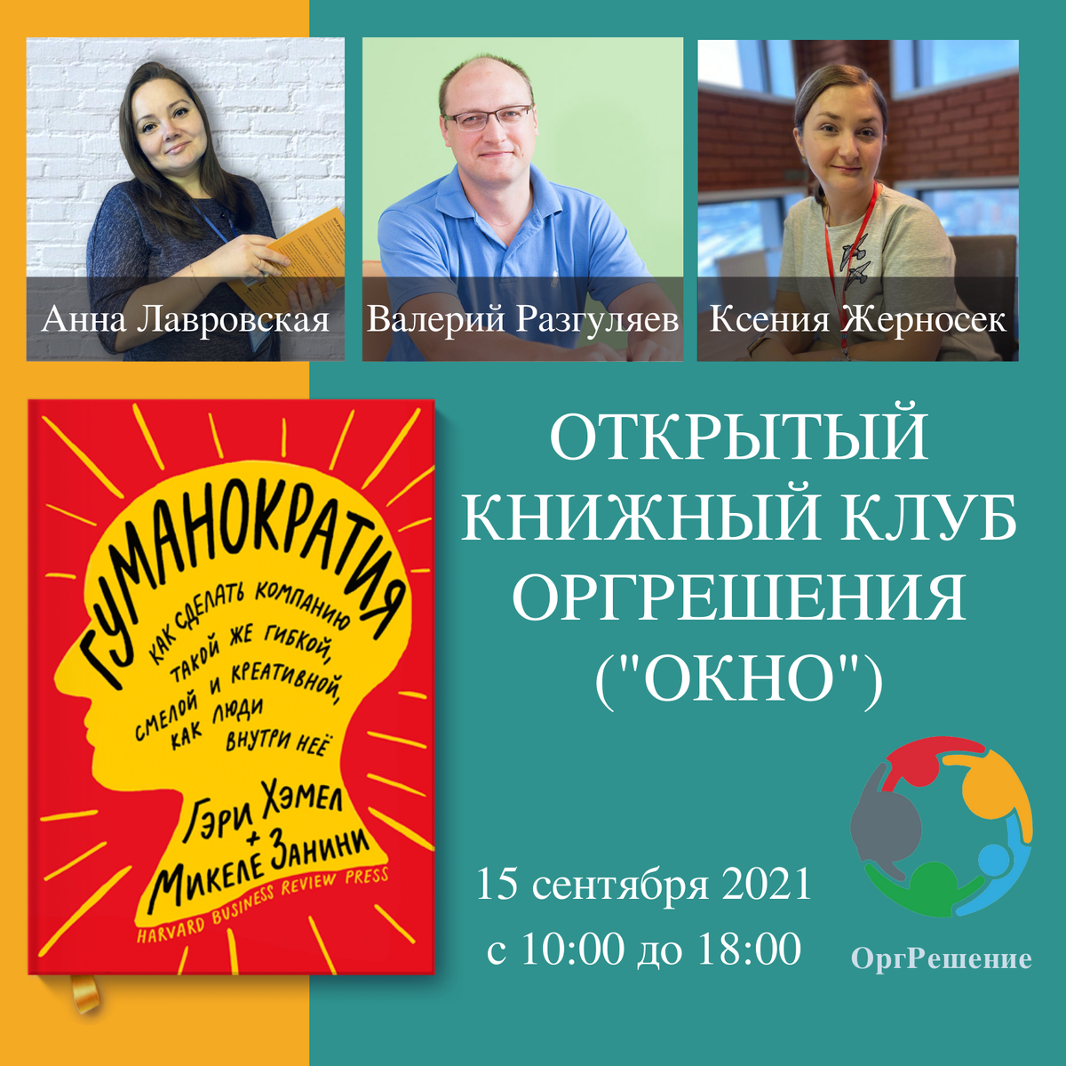 Коллеги и друзья! 📆 15 сентября 2021 года мы приглашаем вас на встречу нашего любимого Открытого КНижного клуба ОргРешения по нашей любимой теме “бирюзового” или гибкого управления: “Гуманократия. Как сделать компанию такой же гибкой, смелой и креативной, как люди внутри нее”. В этой книге очень удачно собран богатый опыт многих компаний, идущих по пути внедрения и реализации принципов самоуправления, доверия и сопричастности сотрудников общему делу компании. Если эти темы волнуют и вас, приходите обсуждать и делиться пользой! ✒ Зарегистрироваться на мероприятие можно здесь. ⏰ 15-го сентября мы с вами встретимся в 10:00 на 11-м этаже БЦ "Орбита-2", в офисе компании "ВкусВилл", в зале "Пломбир" (Москва, улица Кулакова, 20к1). На встрече мы не только обсудим книгу, мы проведем глубокую работу по осмыслению идей и инструментов из книги и вместе с вами переложим эти идеи на вашу практику. А наш приглашенный спикер Валера Разгуляев вместе с нашими консультантами экспертами Анной Лавровск