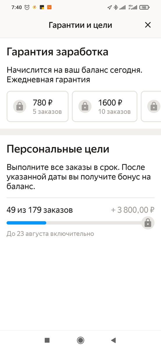Агрегатор Яндекс переодически мотивириует водителей выполнять больше заказов предлагая премии за выполнение количество в определенное время. В основном он предлагает за неделю выполнить больше заказов, чем обычно это делает водитель. Мотивация эта рассчитывается для каждого водителя индивидуально. Эта штука полезна, если вы только начинаете работать или очень редко работаете с Яндексом. Как я уже писал я работаю через Яндекс постоянно, поэтому алгоритм ставит мне цели практически невыполнимые. Так как у меня есть основная работа, то таксую я два через два. Из этого имеем из недели я могу работать максимум четыре дня. Гарантия у нас максимально дается за сорок заказов, следовательно делать больше за день не имеет смысла( хотя на данный момент и 40 заказов довольно трудно сделать). Из этого имеем по сорок заказов четыре дня 160 , а мне до бонуса нужно 179. Получается мне после двенадцати часовой смены нужно ещё выходить таксовать. Мне конечно нужны деньги, но гнобить себя, а тем бол