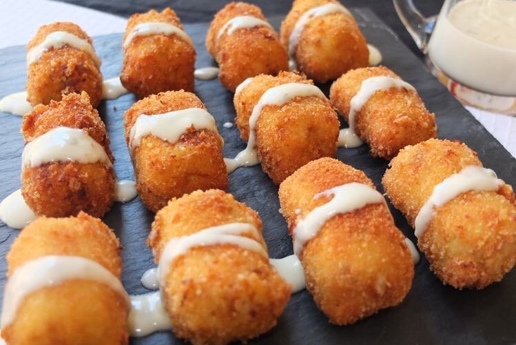 Крокеты — одни из самых популярных тапас в Испании, и в каждом регионе их делают по-своему. Это вкусное и весьма удобное с практической точки зрения блюдо: если вы хотите эффектно подать оставшуюся от варки бульона курицу, сделайте крокеты. ИНГРЕДИЕНТЫ (приблизительно 24 крокета) 200 г вареной курицы, мелко разобранной по волокнам 35 г мелко нарезанного репчатого лука 1 зубчик чеснока, мелко нарезанный 100 г сливочного масла 1 л цельного молока 300 г муки 3 крупных свежих яйца, взбитых 200 г панировочных сухарей 300 мл оливкового или подсолнечного масла для жарки соль, перец, мускатный орех по вкусу По желанию 100 г мелко нарезанного хамона серрано ПРИГОТОВЛЕНИЕ В кастрюле распустить сливочное масло и на медленном огне пассеровать лук и чеснок (8 минут). Добавить 200 г муки и готовить, помешивая, до золотистого цвета. Медленно влить молоко и продолжать помешивать, пока не получится густой и красивый соус бешамель. Так же, не переставая помешивать, чтобы соус не пригорел, добавить в н