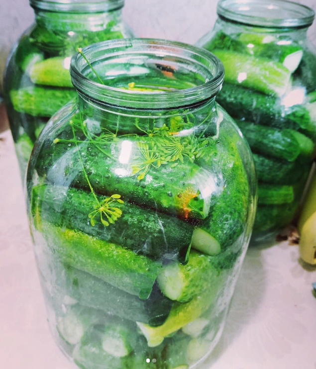2. Аккуратно заливаем кипящим раствором огурцы, закрываем банки прокипяченной крышкой: 3 литровые оставляем на 20 минут, 2 литровые на 15 минут.