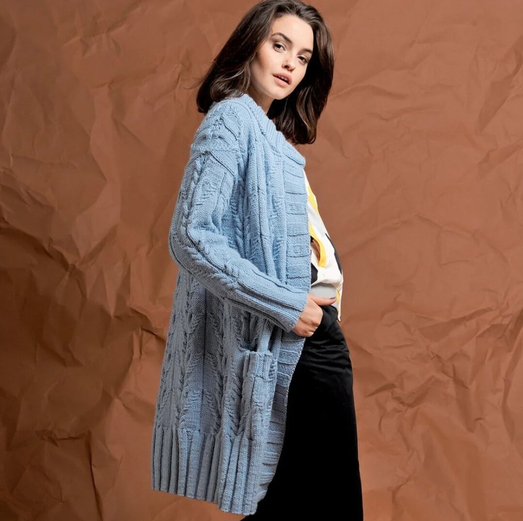 Размер: 38—42 ВАМ ПОТРЕБУЕТСЯ: Пряжа (100% шерсти; 180 м/100 г) — 1000 г светло-голубой; спицы №5; круговые спицы №5; вспомогательная спица; крючок №4,5; 5 кнопочных застежек. ЛИЦЕВАЯ ГЛАДЬ: Лицевые ряды — лицевые петли, изнаночные ряды — изнаночные петли. ИЗНАНОЧНАЯ ГЛАДЬ: Лицевые ряды — изнаночные петли, изнаночные ряды — лицевые петли. УЗОР ДЛЯ ПЛАНКИ: Вязать 3 п. лицевой глади, * 4 п. изнаночной глади, 4 п. лицевой глади, от * постоянно повторять, закончить 4 п. изнаночной глади и 3 п. лицевой глади. УЗОР «КОСА» НА 28 ПЕТЛЯХ: Вязать по схеме. На ней приведены только лицевые ряды, в изнаночных рядах все петли вязать по рисунку. Раппорт постоянно повторять. С 1-го по 22-й ряд выполнить 1 раз, затем с 3-го по 22-й ряд постоянно повторять. Плотность вязания: 22 п. х 24 р. = 10 x 10 см, связано узором «коса»; 19 п. х 24 р. = 10 x 10 см, связано лицевой гладью. СПИНКА: На спицы №5 набрать 116 п. и вязать между кромочными 15 см узором для планки, при этом в последнем ряду равноме