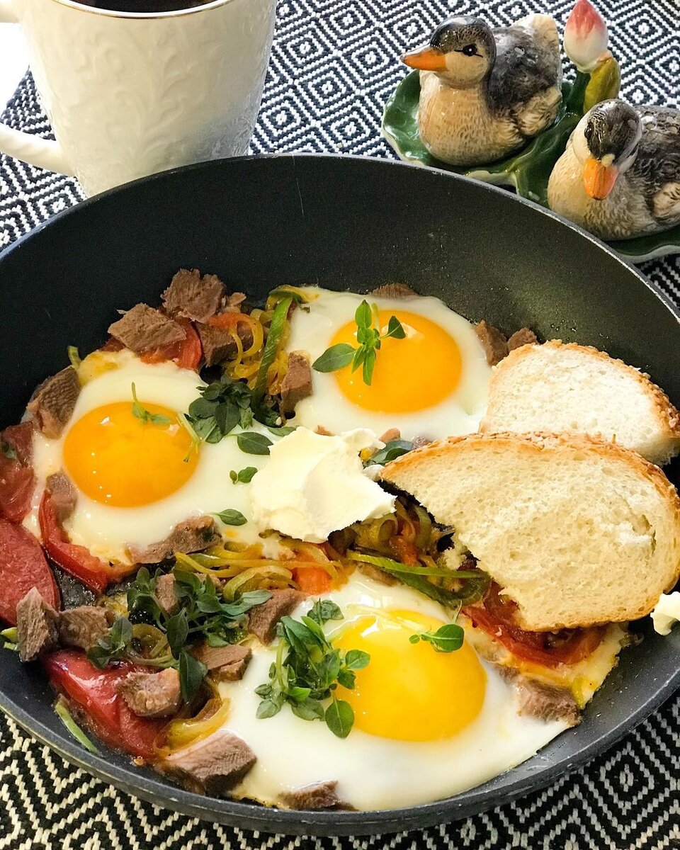 Потом нужно подобрать правильную сковороду: не слишком большую, но и не маленькую, с невысокими наклонными бортиками, чтобы готовая яичница могла легко соскользнуть в тарелку. Обойдёмся ли плитой, или придётся разогреть духовку? И вообще, сколько яиц на порцию следует взять?