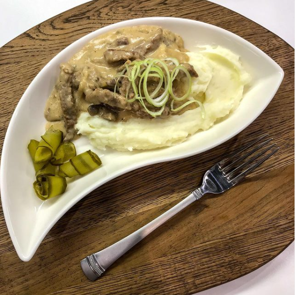 Для бефстроганова берут обычно говяжью вырезку или филе поясничной части, мясо слегка отбивают в куске, а затем разделывают на прямоугольники 5-6 см длиной и 1 см толщиной. Из этих прямоугольников нарезают узкие кусочки-полоски толщиной от 0,5 до 1 см. Разделывать мясо надо обязательно поперек волокон, чтобы оно легче жевалось.