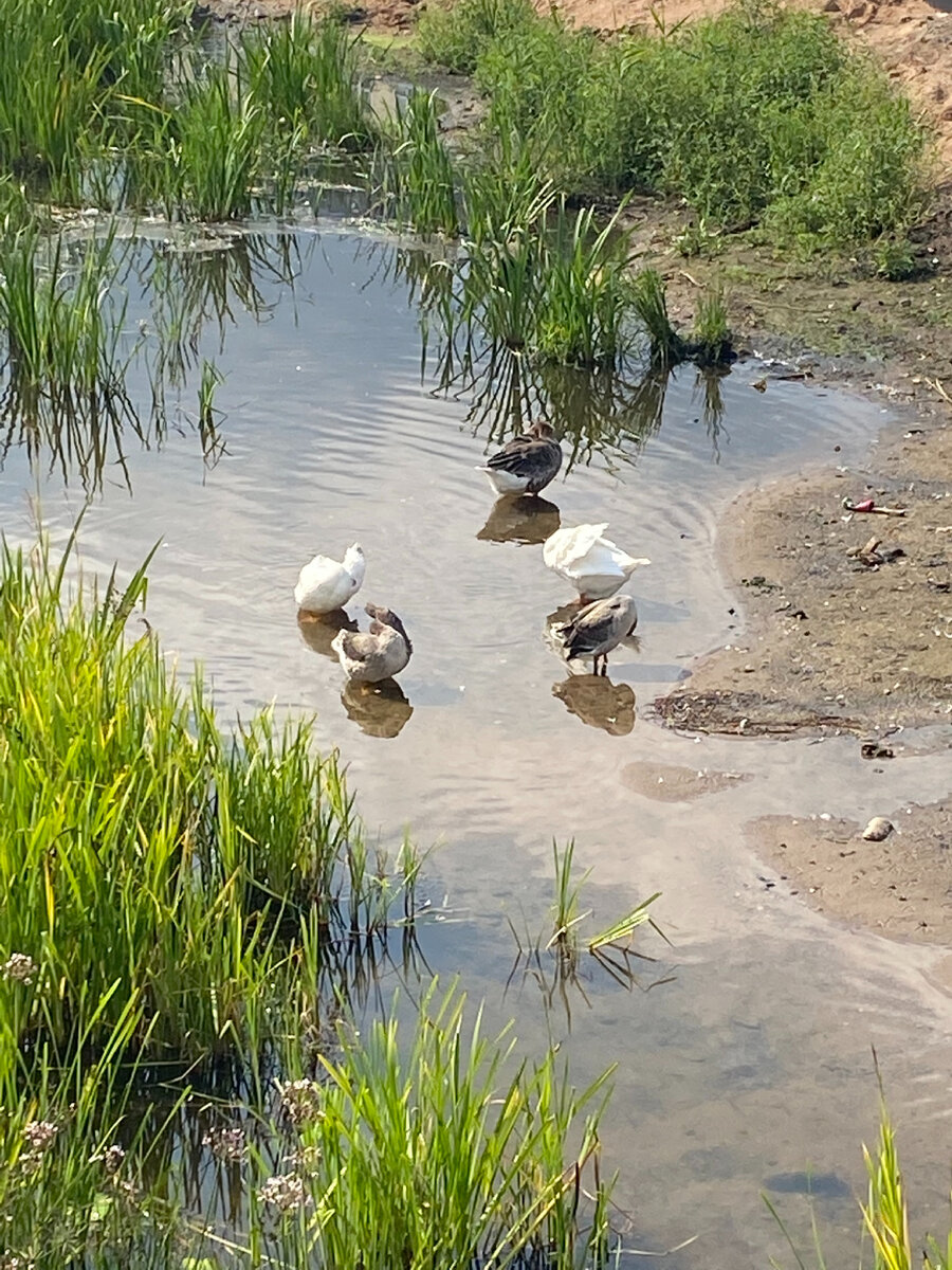 они туда прилетают из дома, узнали , что живут они неподалёку и под мостом моются , плавают и кушают . Очаровашки .