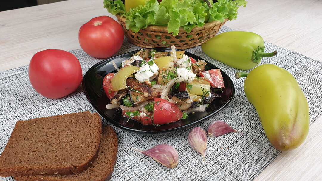 Невероятно вкусный салат из баклажанов с помидорами и брынзой. Готовим теплый салат из баклажанов.