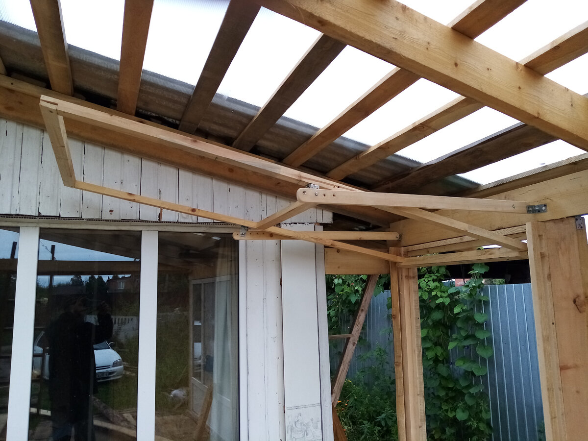 Всем здравствуйте! Это опять ваш Кот Тимофеич, которому эксперимент и интересное занятие, дороже скучной и рутинной работы. Начало дурацким экспериментам, положило строительство каркасного гаража. Каркасное строительство и ендовая крыша мне давно знакомы. А так же я не собирался зашивать стены досками, а делал в размер пластиковых панелей. Где я их достал, я говорить не буду. Скажу что они БУ, но хорошего качества. Правда стеклопакеты были с треснувшими стёклами, но я их заменил на пластик. Таким же пластиком у меня покрыта крыша над гаражом, что делает его похожим на теплицу. Зато светло будет и без электричества. Вопрос возник только по поводу ворот для гаража, но начал я с дверей, которые выменял у тёщи за четыре мешка дров. Но дверь оказалась тяжёлой и не в размер. А поскольку эта филёнчатая дверь, то тупо укоротить её не получится. Вот поэтому я отставил дверь в сторону и полез в интернет. Слепить две половинки ворот не проблема. Проблема эти ворота постоянно открывать и подпират