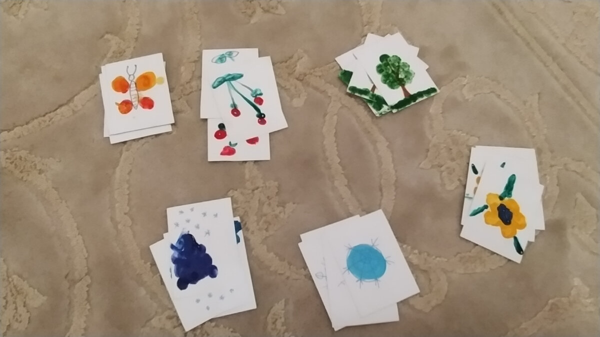 Любим мы настольные игры - причем не только покупные, но и самодельные. Предлагаю сделать простенькую, но очень увлекательную игру, в которую можно поиграть с ребенком (да и не только, если честно). Она больше на интуицию, но и простор для мыслей тоже найдется. Для начала понадобится вырезать из плотного белого картона 20 совершенно одинаковых карточек. Затем разделить их на 5 групп по 4 карточки. 2 группы (т.е. всего восемь карточек) будут посвящены зимней тематике, 3 группы (12 карточек) - летней. Для демонстрации зимней тематики я выбрала снежную тучку и снежинку, вы же можете выбрать эти рисунки или любые другие: дерево в снегу, снеговик, санки... "Про лето" у меня получились такие карточки: цветок, бабочка, ягодки и дерево. А теперь бонус от создания этой игры: можно рисовать пальчиками, а это значит, что с рисунками справится даже двухлетний малыш (но сама игра, конечно, для деток постарше - от 4 лет примерно). Обратите внимание, что все картинки созданы при помощи отпечатко