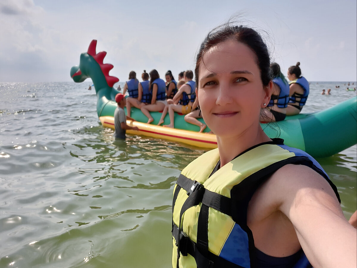 Мы на «Зеленёном драконе» подпрыгивали, визжали, было очень круто. Впечатлений на весь год. Далее он нас отвез в открытое море, и те девчонки, которые захотели поплавать на глубине – прыгнули в воду. Я сидела на месте. Даже потому, что на мне жилет, я все равно опасаюсь воды. Я не умею плавать, и возле берега на кругу мне комфортно.