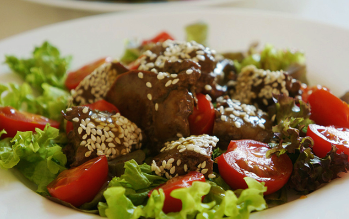 5️) На тарелку выкладываем листья салата, сверху перец и помидоры. Поливаем заправкой. Выкладываем печень и сухарики, украшаем бальзамиком.