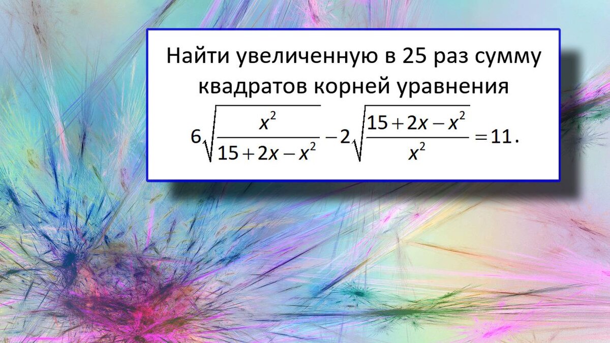Найти увеличенную в 25 раз сумму квадратов корней уравнения Задача В11 из централизованного тестирования 2021 года. На решения 32 задач такого типа отводят 180 минут. В основном задачи стандартные, как и эта. Оформлять решения не требуется, достаточно указать только ответ. Поделитесь своим мнением в комментариях. Достаточно ли времени для решения? Сложная или простая задача? РЕШЕНИЕ Сделаем замену Тогда уравнение примет вид Приведем к общему знаменателю и решим квадратное уравнение Первый корень не подходит, так как t ≥ 0. Сделаем обратную замену Возведем обе части в квадрат По теореме Виета По условию необходимо найти увеличенную в 25 раз сумму квадратов корней уравнения. Получим Ответ: 664.