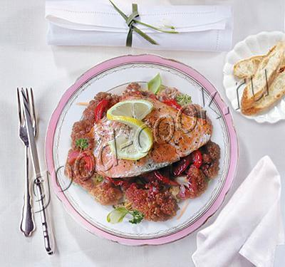 Рецепт ресторанного плана. Очень выгодно смотрится на столе. И на вкус весьма и весьма хорош. Капуста нежная, чуточку кисловатая. Перец вносит аромат и небольшую хрустящесть (он за время приготовления не становится мягким и вываренным, а остаётся упругим). Ну а про жареную сёмгу и говорить не надо.
