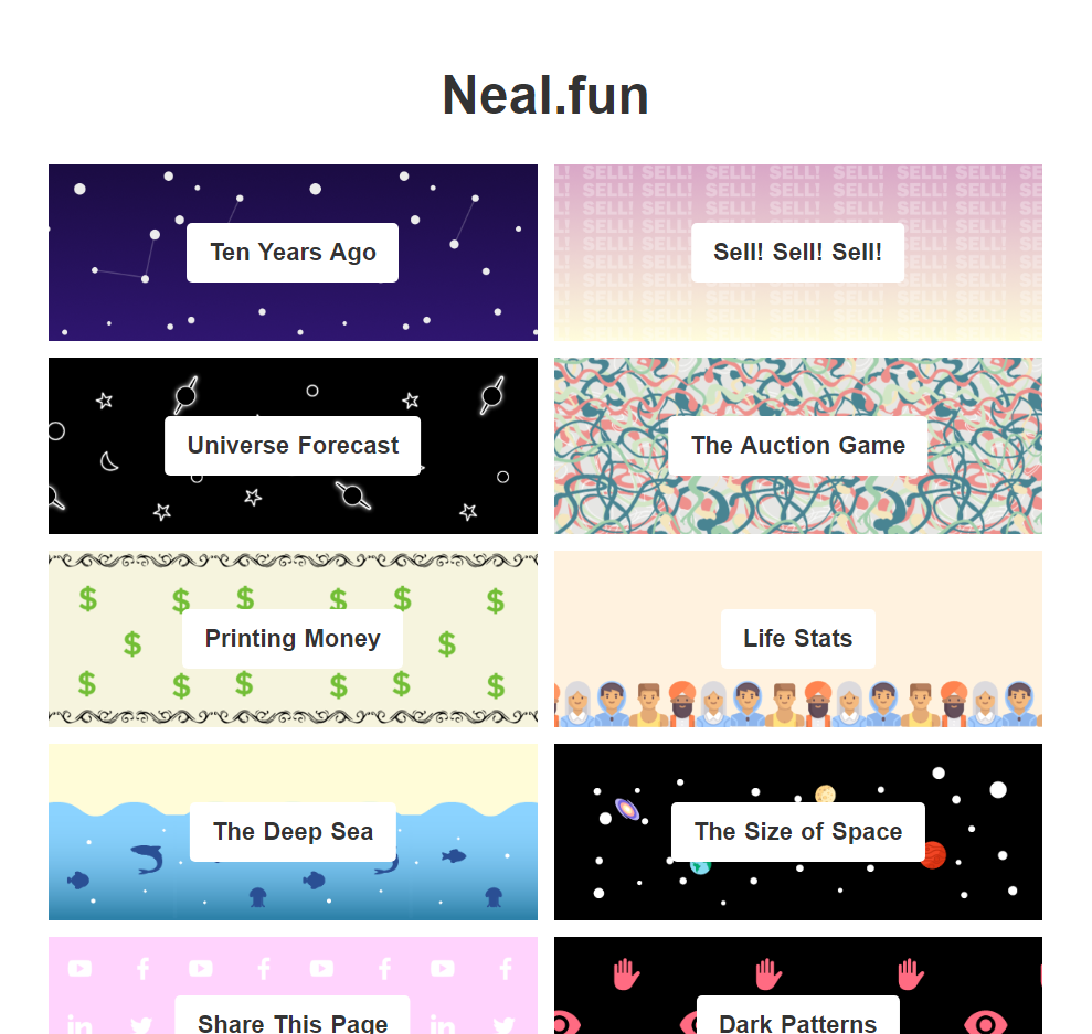 Чем заняться, когда тебе нечего делать, но хочется развлечений? Список из 10 сайтов, которые не дадут тебе заскучать дома. 1. Neal.fun На этом сайте есть множество развлечений, например "Ten years ago" Здесь вы может выбрать любой понравившийся сайт из списка, и вы увидите, как он выглядел 10 лет назад... Возьмем следующий пример "The Deep Sea"