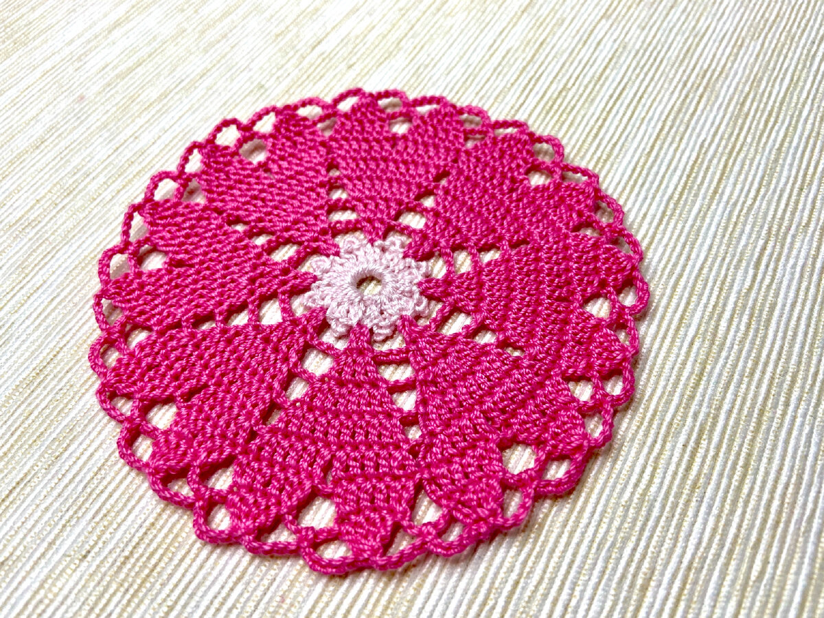 Люблю вязать салфетки крючком. И очередной мастер-класс посвящен тоже салфетке с сердечками. В тетради с записями по вязанию крючком нашлось только описание, без схемы. Им и поделюсь с вами. И вот такая вязаная салфетка с сердечками должна получиться в итоге. Люблю использовать для вязания крючком салфеток пряжу Сеам Анна 16. Под эту пряжу я обычно беру крючок размером 1,25 мм. Он отлично подходит для оптимальной плотности вязания крючком. Для салфетки с сердечками я выбрала два оттенка розового цвета, поскольку люблю вязать салфетки, используя несколько цветов. Больше информации по подбору пряжи и крючка можно найти в статье: Сокращения условных обозначений элементов вязания крючком, которые используются в описании: вп - воздушная петля; сс - соединительный столбик; сбн - столбик без накида; с1н - столбик с 1 накидом. Ряд 1. Наберите на крючке 8 вп. Сделав 1 сс в последнюю от крючка вп, создайте кольцо из вп. Ряд 2. Наберите 3 вп для подъема, 1 с1н, 3 вп, 1 сс в верхушку с1н, откуда